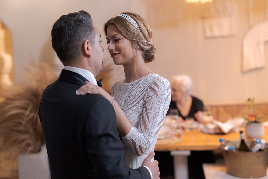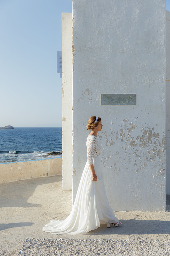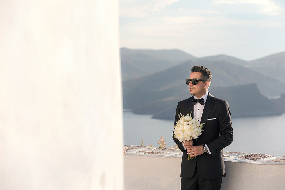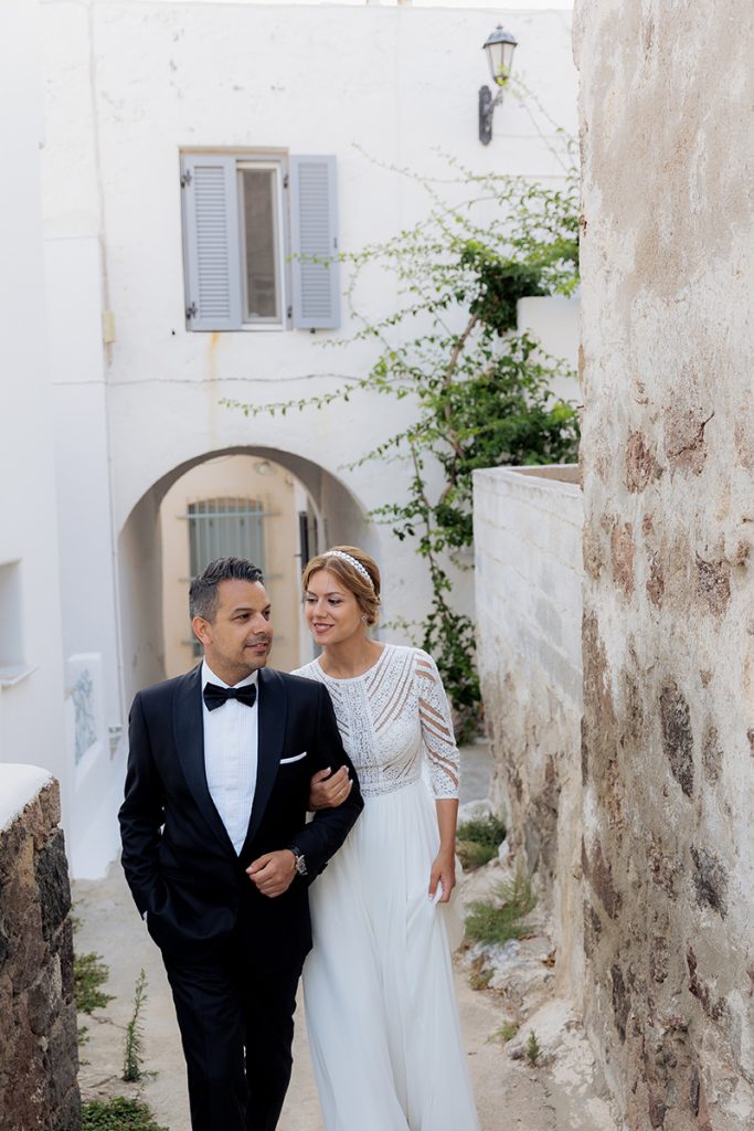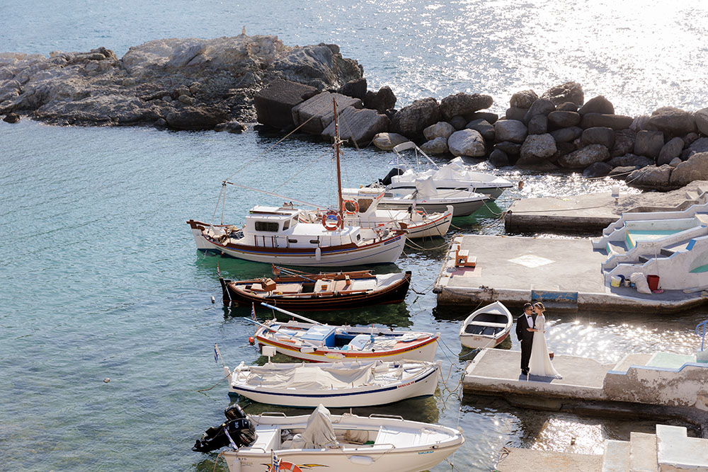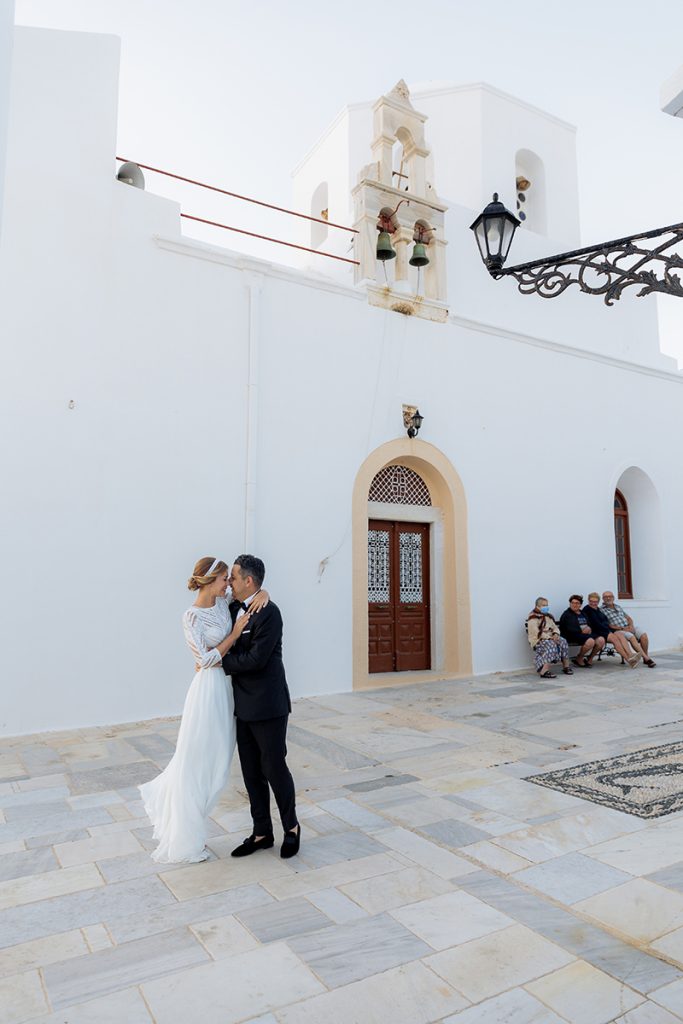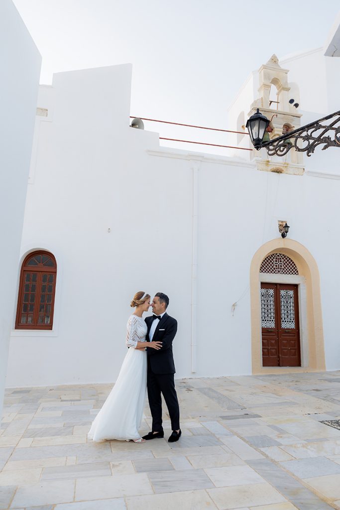 To complete their love story, we explored the iconic landscapes of Milos for an after-wedding session. Sarakiniko’s lunar-like white rock formations provided a stunning contrast to the couple’s elegance, while hidden gems around the island added to the magic of their journey.